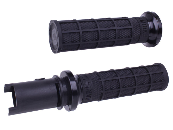 This Moto-inspired Full-Waffle design was developed to provide improved comfort by reducing vibration while also offering a grip exceptional traction and control in severe riding conditions. The ODI genuine Lock-On™ technology was used to provide the most secure mounting system while also allowing easy installation and removal. Each set is manufactured with an in-molded throttle tube specific to your model. The proven billet-aluminum clamp system is made available in anodized colors to match the components on your custom build. Enjoy the good ride.